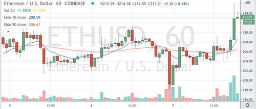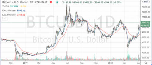 At press time bitcoin (BTC) was trading up 6.5% over 24 hours, currently at $9,882. It’s been on a run upward on high volume since 12:00 UTC (8 a.m. ET), moving from $9,270 during that time to as high as $9,971 on spot exchanges like Coinbase.
