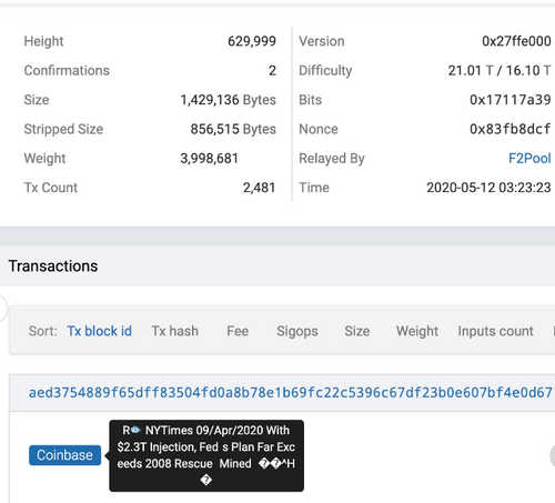 CoinDesk’s Wolfie Zhao noted Monday in an article about the halving that Chinese bitcoin-mining pool f2pool, which won the reward for block No. 629,999, embedded a message into the blockchain record: «NYTimes 09/Apr/2020 With $2.3T Injection, Fed’s Plan Far Exceeds 2008 Rescue.”
