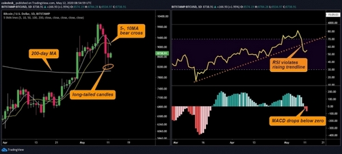 With the lackluster performance in recent days, though, it seems safe to say that halving was priced in. As a result, the uptick seen at press time could be short-lived, more so, as the technical charts are sending bearish signals.