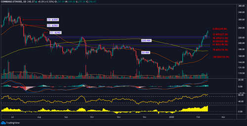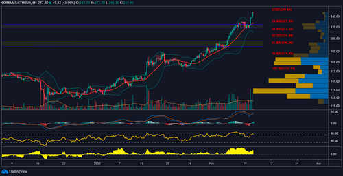 Below this level, there appears to be strong support at $226 and $222. If the price drops below the lower Bollinger Band arm ($210.66) then a drop to the 61.8% Fibonacci retracement at $191.77 could occur but given the technical strength of Bitcoin and Ether’s recent moves, this seems an unlikely scenario.