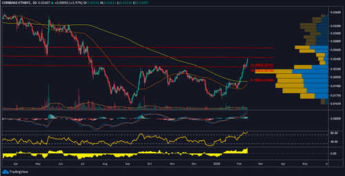 As Bitcoin rallied on Feb. 12, many altcoins pulled back in their BTC pairs but Ether succeeded in holding on to its gains and currently registers a 14.3% gain.