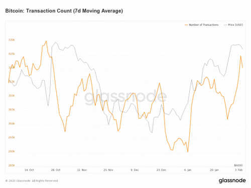 Although the number of transfers to exchanges declined, the number of transactions recently saw an upswing along with price. The seven-day average of transactions jumped rose from 290,200 on Jan. 6 to a three-month high of 324,745 on Feb. 3.
