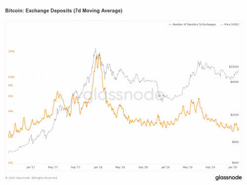 The number of bitcoin on-chain deposits has dropped sharply over the last six months, indicating a strong optimistic or “HODLing”, sentiment in the market.