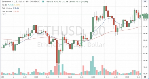 Digital assets on CoinDesk’s big board are mostly in the green on Friday. Ether (ETH), the second-largest cryptocurrency by market capitalization, less than a percent in 24 hours, trading at $213 as of 20:00 UTC (4:00 p.m. EDT).