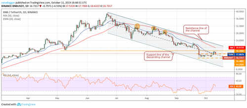 Binance Coin (BNB) turned down from just under $18.30. The bears will try to resume the down move while the bulls will try to form a higher low. If the cryptocurrency turns around from $16.4882 and breaks above $18.30, it will signal a possible change in trend. A breakout of the 50-day SMA and the resistance line of the descending channel will confirm the start of a new uptrend.