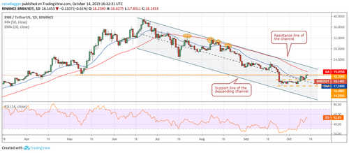Binance Coin (BNB) bounced off the previous resistance turned support of $16.4882 on Oct. 12. This shows the formation of a higher low in the short-term time frame. The 20-day EMA is flattening out and the RSI has risen above the midpoint, which suggests that the selling has subsided and the bulls are gradually making their presence felt.