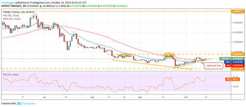 If the TRX/USD pair again reverses direction from $0.018660, a dip to the uptrend line and below it to the moving averages is likely. A breakdown of the moving averages can drag the price to $0.011240.