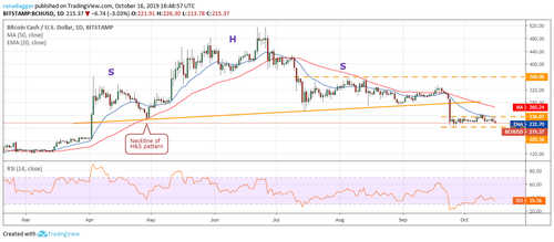 The bears are attempting to sink Bitcoin Cash (BCH) to the bottom of the range at $203.36. If this support cracks, the downtrend will resume and the next stop is likely to be $166.98. With both moving averages turning down and RSI in the negative zone, advantage is with the bears.