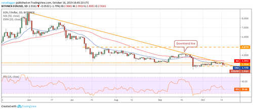 Failure to break out of the downtrend line has attracted selling. EOS has a minor support at $2.8129 below which a retest of the recent lows of $2.4001 is likely. A break below this level can extend the decline to $1.55.