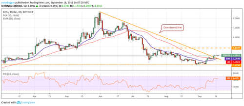 EOS has sustained above the downtrend line for the past three days but it has failed to pick up momentum. The moving averages are on the verge of a bullish crossover and the RSI is in the positive territory, which suggests that bulls have the upper hand.