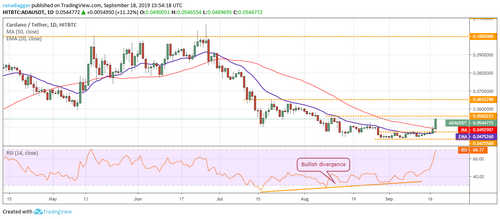 Cardano (ADA) rose above the 50-day SMA on Sept. 17, but did not close (UTC time) above it, hence, our buy suggestion given in the previous analysis did not trigger. Currently, the price has risen sharply above the 50-day SMA. There is a minor resistance at $0.0560221 above which a rally to $0.0652290 is possible.