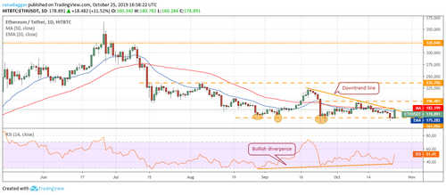 Above this, the ETH/USD pair can rise to $235.70. Therefore, traders can buy on a breakout and close above the 50-day SMA with a stop loss of $150. The bullish divergence on the RSI also points to a rally. Our bullish view will be invalidated if the pair turns down from the downtrend line and plummets below $150.
