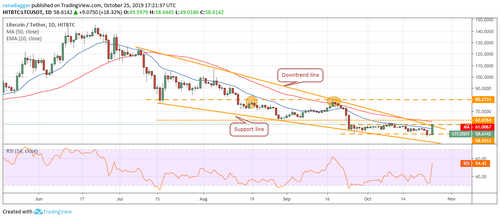 Litecoin (LTC) has bounced sharply from the lows of Oct. 23. The bulls are attempting to break above the downtrend line, which is a stiff resistance. Above this level, the next resistance is likely to be the 50-day SMA. If the price turns down from this zone, it will extend its stay inside $47.1851 to $59.9743 range.
