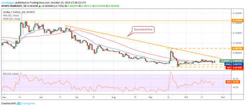 Stellar (XLM) is trying to form a higher floor at $0.056. The bulls purchased the dip to this level on Oct. 23, which is a positive sign. If the buyers can push the price above the downtrend line, a rally to $0.088708 is possible.