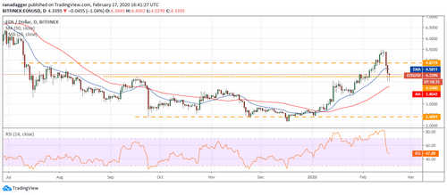 We had suggested the possibility of a pullback in EOS as the RSI was in the deeply overbought territory. However, we had expected the price to find support between $4.8719 and the 20-day EMA at $4.58.