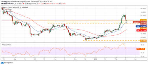 Binance Coin (BNB) plummeted below the support at $23.5213 and reached the next support at $21.80 on Feb. 16. Though the price rebounded sharply from $21.80, the bulls could not carry it above $23.5213, which shows selling at higher levels.
