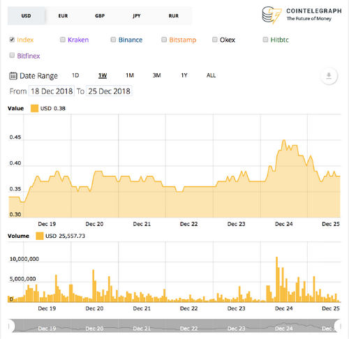 Second-largest crypto by market cap Ripple (XRP) has fared even worse, shedding a stark 15 percent over the 24 hours before press time, according to Cointelegraph’s Ripple Price Index. The asset is currently trading at $0.38 — following an intraweek peak at $0.45 yesterday. On its weekly chart, Ripple is nonetheless a strong 31.5 percent in the green, with monthly losses at a mild 7 percent.