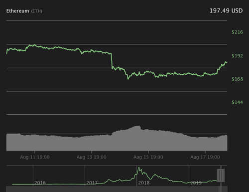 Top altcoin Ether (ETH) has posted a strong gain of over 7% and is trading around $197 by press time. Having dropped below the $200 mark on Aug. 14, Ether’s fresh gains are now edging it back above this threshold. Losses on the week remain at a stark 7.86%.
