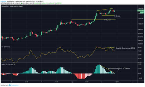 - Prices may pullback to key supports at $10,318 and $10,172 first, as the hourly chart is reporting bearish divergence of key indicators.
