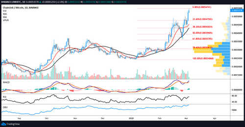 In the event that the price pulls back, traders can first watch the 12-MA, and the 23.6% Fibonacci Retracement level at 0.00047359 and below this at 0.00046279 Satoshis to 0.00043965 Satoshis which also lines up with 2 high volume nodes on the volume profile visible range indicator (VPVR).