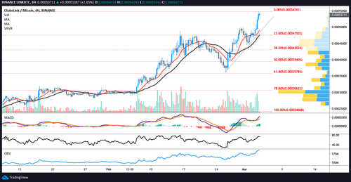 If for some reason the market turned sour and LINK price pulled back, there is plenty of underlying support at $4.42, $4.31 and $4.11. Below $4.11, the price previously bounced at the 50% Fibonacci Retracement level ($3.27) 4 times, most recently on Feb. 26.