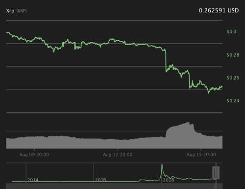 XRP, the second-largest altcoin by market cap, is trading at $0.262 and trending down by 0.24% on the day. Like many of the top cryptocurrencies, XRP has been slumping this week. Unlike BTC and ETH, however, XRP has not managed to get back into the green as of press time.
