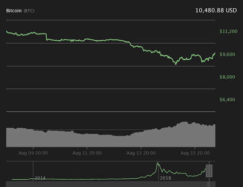 Bitcoin is trading at $10,480 at press time, representing a 4.58% price increase on the day. Bitcoin is seeing some momentum for an upward climb, peaking at $10,500 so far and continuing to stay away from the four-figure mark it fell to yesterday.