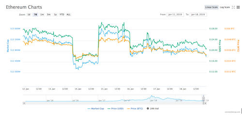 Considerably less volatile, top cryptocurrency Bitcoin has seen negligible price change over the past 24 hours, down 0.45 percent on the day to trade at $3,645. After an intraweek low of ~$3,550 Jan. 13, Bitcoin has recovered to trade just 1.6 percent down on its 7 day chart. On the month, the coin is up by 3 percent.