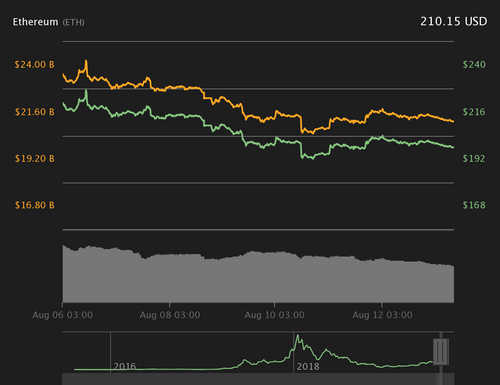 Ether (ETH), the largest altcoin, at the same time contracted 1.5% as a continued bearish trend takes the token ever lower against both USD and BTC. Ether has not traded at current levels against BTC since March 2017.