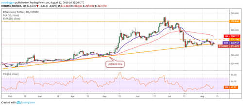 Ether (ETH) declined below the uptrend line on Aug. 9, but the bears could not break below the psychological support of $200. The bulls are now attempting to propel the price back above the uptrend line. If successful, the digital currency will again try to break out of $235.70. A move above this level is likely to resume the uptrend. We might suggest a long position on a close Coordinated Universal Time (UTC) above $235.70.