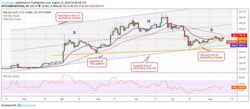 Bitcoin Cash (BCH) bounced from $300.11 on Aug. 10, hence our recommended stop loss of $300 on the long position did not trigger. This is only a matter of chance as sometimes the stops hit and sometimes they miss by a whisker.