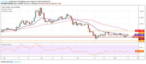 EOS is attempting to consolidate in a downtrend. It held the critical support of $3.8723 on Aug. 9 and 10, which shows buying at lower levels. However, the bounce from the support lacks strength because it has not been able to move above the 20-day EMA. If bulls can push the price above the 20-day EMA, the cryptocurrency can reach the 50-day SMA, which is close to the horizontal resistance of $4.8719. We anticipate a stiff resistance at this level, but if the price breaks out of it, a new uptrend is likely.