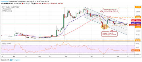 Bitcoin SV (BSV) has been trading between the support of $136.89 and the 20-day EMA for the past few days. This tight range trading is unlikely to continue for long. We expect a breakout of the 20-day EMA or a breakdown of $136.89 within the next few days.
