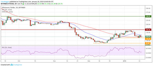 Ethereum (ETH) bounced off the critical support at $116.3 on Jan. 14, but failed to break out of the 20-day EMA. It is currently stuck between both moving averages.