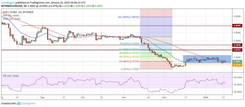 EOS is trading inside the range of $2.3093–$3.2081. Currently, the bulls are facing resistance at the moving averages. If this resistance is scaled, a rally to the top of the range will be probable.