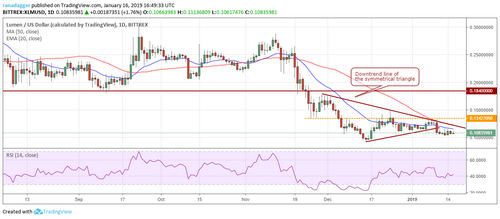 A break out of the downtrend line of the symmetrical triangle can carry the XLM/USD pair to $0.13427050. Above this level, we anticipate a quick move to $0.184.