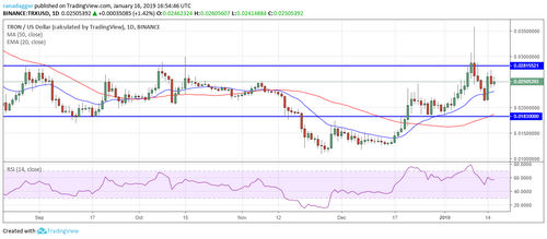 Tron (TRX) is finding it difficult to break out of $0.02815521. On Jan. 15, it turned down from the area of the upper end of the range. If the price takes support at the 20-day EMA, the bulls will attempt to break out of the range again. The uptrending moving averages and the RSI show that the demand currently outweighs the supply.
