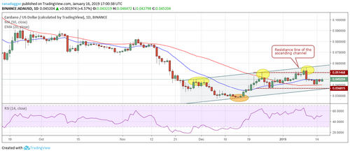 If the ADA/USD pair breaks out of the 20-day EMA, a rally to $0.051468, followed by a move to the resistance line of the ascending channel, will be probable.