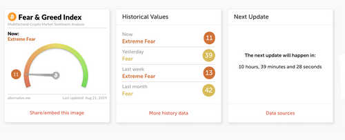 Today the current Fear Greed Index is an 11, which points to “extreme fear” in regard to the crypto community’s emotions and sentiments.