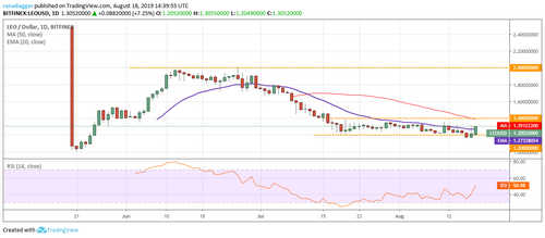 Due to a short trading history, we will analyze the daily chart on the LEO/USD pair. The bears broke below the support of $1.20 on Aug. 16, but could not capitalize on it. Buying at lower levels propelled the price back above $1.20 on Aug. 17. This is a positive sign as it shows that the sentiment is to buy on dips.