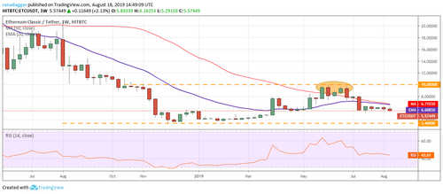 The ETC/USD pair has been consolidating in a large range of $3.40 to $10 for the past ten months. Both moving averages are trending down marginally and the price has been trading below it for the past five weeks. The RSI has also dipped into the negative zone, which suggests that bears have the advantage in the near term. This increases the possibility of a fall to $3.40.