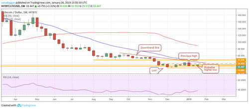 The LTC/USD pair is attempting to put a bottom in place. After the initial pullback from the low of $23.090, the bulls have held the support at $29.349 for the past five weeks. This increases the probability of this level being a higher low. We will get a confirmation if the price breaks out of the downtrend line and the previous swing high of $40.784.