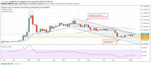 The BNB/USD pair has reached the resistance line of the descending channel. The 20-week EMA is also placed just above the channel. Therefore, we anticipate a strong resistance in the zone of $7.17–$7.7.