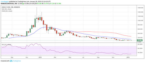 The long-term trend in the DASH/USD pair is still down. The bulls are attempting to form a higher low around $67. However, both moving averages are trending down, and the RSI is also close to the oversold levels. This shows that the sellers currently have the upper hand. If the bears sink the cryptocurrency below $56.214, the downtrend will resume.