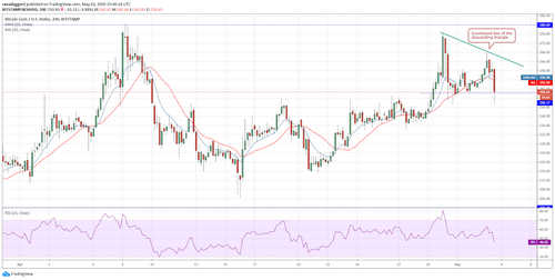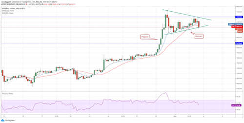 Conversely, if the BTC/USD pair reverses direction from the current levels and breaks out of the pennant, the up move is likely to resume. The target objective of a break above the pennant is $10,900.