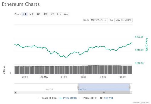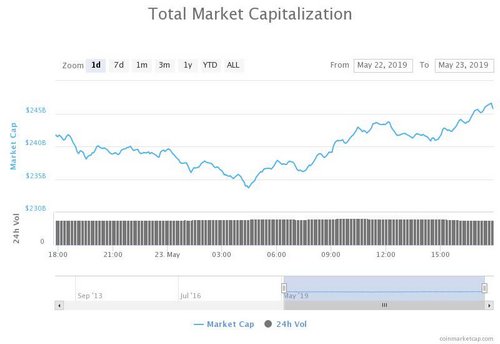 Total market capitalization of all cryptocurrencies is around $245 billion at press time –– up а solid $6 billion from $240 billion at the start of the day. The 24-hour trading volume of all cryptocurrencies on the CoinMarketCap is around $75 billion at press time.