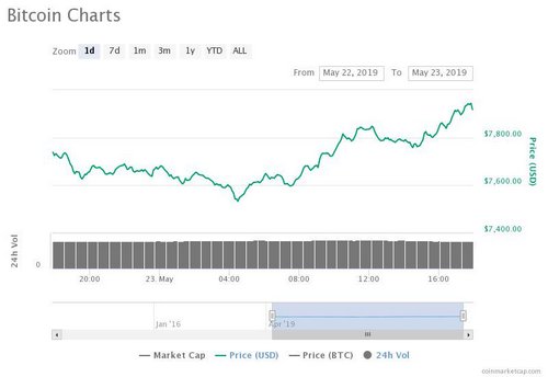 The leading cryptocurrency bitcoin (BTC) started the day at $7,638 gradually reaching its intraday high of $7,946. At press time, bitcoin is trading at around $7,914, up 2.64% over the past 24 hours.
