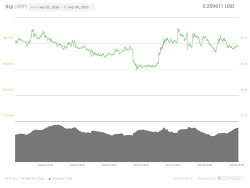 Ripple’s XRP token has continued to trade within a range this week and is currently showing a loss of around 0.82% on the day. At press time, the world’s third-most popular coin is trading at $0.259, which is around the exact same price as seven days ago.