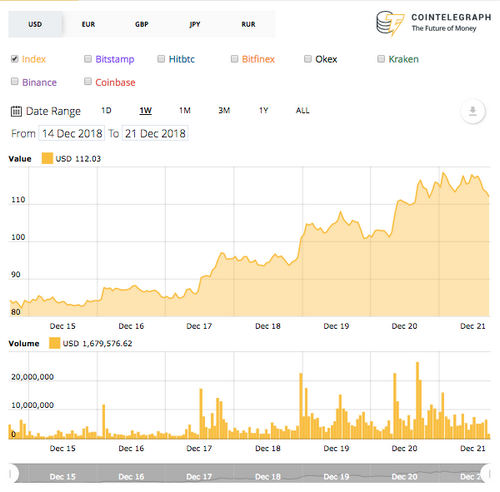Ethereum (ETH) — ranked third by market cap — has lost slightly more over the past 24 hours, down close to 3 percent on the day and trading at $110 to press time. Before today, the altcoin had seen five days of solid growth — climbing back its three-digit value, having dipped to as low as around $82 on Dec. 14.