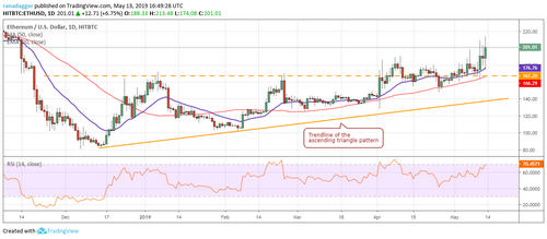Ethereum (ETH) soared on May 11 to above $200, but the bulls could not sustain the rally. After that, the attempt by the bears to plummet the price back into the triangle failed. Currently, the bulls are again trying to sustain above the $200.